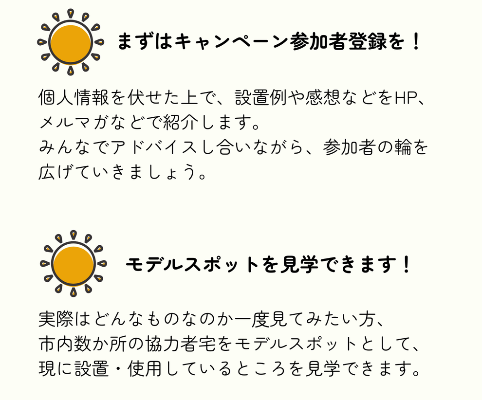 みたか発電では、同キャンペーンの周知宣伝のため、三鷹市内の数か所に『モデルスポット』設置を計画中。ソーラーシステムを実際に使っているところを見てみたい市民のために、見学を受け入れてくださることを条件に、機器代金・取り付け費用すべてみたか発電の負担で発電システムの設置をいたします。
