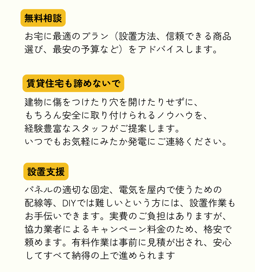 窓の傍に、庭やベランダの一角に、ソーラーパネル1枚つけるだけで始められます。住宅、事業所、商店など、どなたでも、ぜひいっしょにやりましょう!