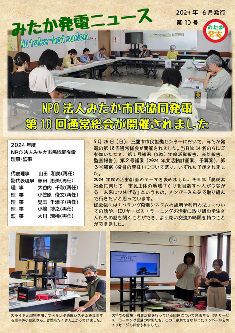 2020年のみたか発電総会は新型コロナウィルス感染防止の観点から、初のオンライン総会となりました。 正会員48人中、書面表決・表決委任も含めた31人が出席、 第1号から第3号のすべての議案が満場一致で承認されました。 今年度は理事5名、監事1名でのスタートです。地域に密着した活動をしていきます。 応援よろしくお願いいたします。